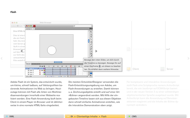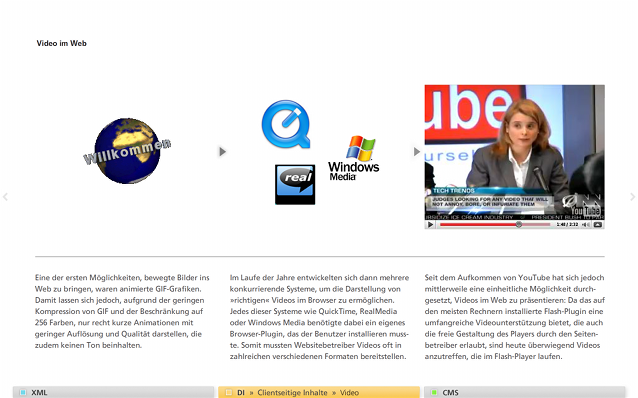 Im Speziellen war ich für die Seiten »Dynamische/Statische Inhalte auf Client/Server«, »PHP«, »Flash« und »Video im Web« zuständig, die als statische Bilder in der untenstehenden Galerie betrachtet oder »in Aktion« in der fertigen Anwendung ausprobiert werden können.