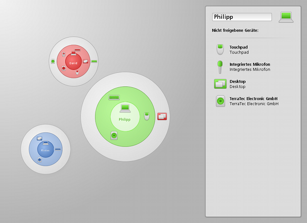 Bei Klick auf einen Rechner oder ein Gerät sind verschiedene Einstellungen möglich, etwa für wen ein Gerät freigegeben ist. Für die Freigabe sind zwei Modi möglich: Generelle Erlaubnis, außer für bestimmte Rechner, oder gezielte Freigabe für einzelne Rechner. Des Weiteren kann z.B. eingestellt werden, ob der »Besitzer« eines Geräts gefragt wird, wenn ein anderer Benutzer es einbinden möchte. Auch gerätespezifische Einstellungen sind möglich. Ebenso besteht die Möglichkeit, für ein lokales Gerät mehrere Profile mit verschiedenen Einstellungen zu erstellen, die dann für andere Rechner als verschiedene Geräte erscheinen bzw. für verschiedene Nutzer freigegeben werden können.