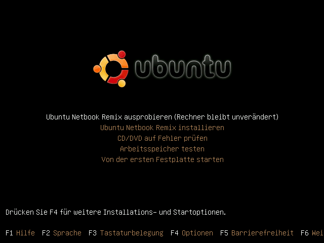 Im Ubuntu-Menü kann man nun die Sprache auswählen, anschließend drückt man die Eingabetaste, wählt dann Ubuntu Netbook Remix ausprobieren (Rechner bleibt unverändert) und startet mit einem weiteren Druck der Eingabetaste das Betriebssystem von der CD. Hier kann man nun alles ausprobieren, was sofort funktioniert. Um die anderen Dinge – Netzwerk, Mikrofon und Sondertasten – kümmern wir uns nach der Installation.
