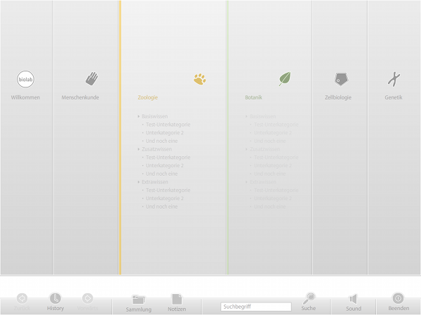 In diesem Projekt im Rahmen der Lehrveranstaltung »Interaktive Systeme I« ging es darum, für die Lernsoftware »Biolab« aus dem Klett-Verlag ein zeitgemäßes, modernes und funktionales Design zu entwickeln. Dabei wurde in Teams zu je drei Studenten gearbeitet.