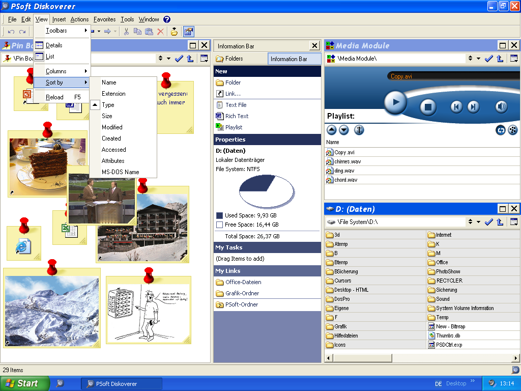 Denn ich war so begeistert und überzeugt von meinem Multi-Fenster-in-einem-Ansatz, dass ich mir dachte: Warum soll man in diesem Programm nur Ordner betrachten können? Warum nicht viel mehr? Schon war die Idee geboren, PSoft Diskoverer von einem Dateiverwaltungs- in ein Universalprogramm zu verwandeln, in dem man die Dateien auch öffnen, betrachten und bearbeiten, Musik hören, im Internet surfen, die Registry verwalten, Berechnungen anstellen und alles mögliche mehr können sollte. Dazu wurde es mit einem Erweiterbarkeits-Framework versehen werden, sodass das eigentliche Programm nur noch die Hülle wäre und alles andere über beliebig kombinierbare Module bereitgestellt werden sollte: PDMS, das PSoft Diskoverer Modul-System, war geboren.