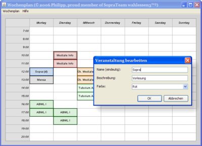 Als Vorbereitung auf die große Herausforderung des Software-Grundpraktikums und als kleine Hürde zu Beginn musste von den noch nicht zusammengefügten Teams ein digitaler Wochenplan erstellt werden. Dieser sollte in der Lage sein, die Termine einer Woche zu verwalten, tabellarisch darzustellen, abzuspeichern und auszudrucken. Ein Pflichtenheft war hierfür bereits vorgegeben, es musste also nur noch in Delphi oder Java mit Datenbank- oder XML-Anbindung umgesetzt werden.