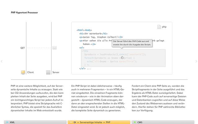 Im Speziellen war ich für die Seiten »Dynamische/Statische Inhalte auf Client/Server«, »PHP«, »Flash« und »Video im Web« zuständig, die als statische Bilder in der untenstehenden Galerie betrachtet oder »in Aktion« in der fertigen Anwendung ausprobiert werden können.